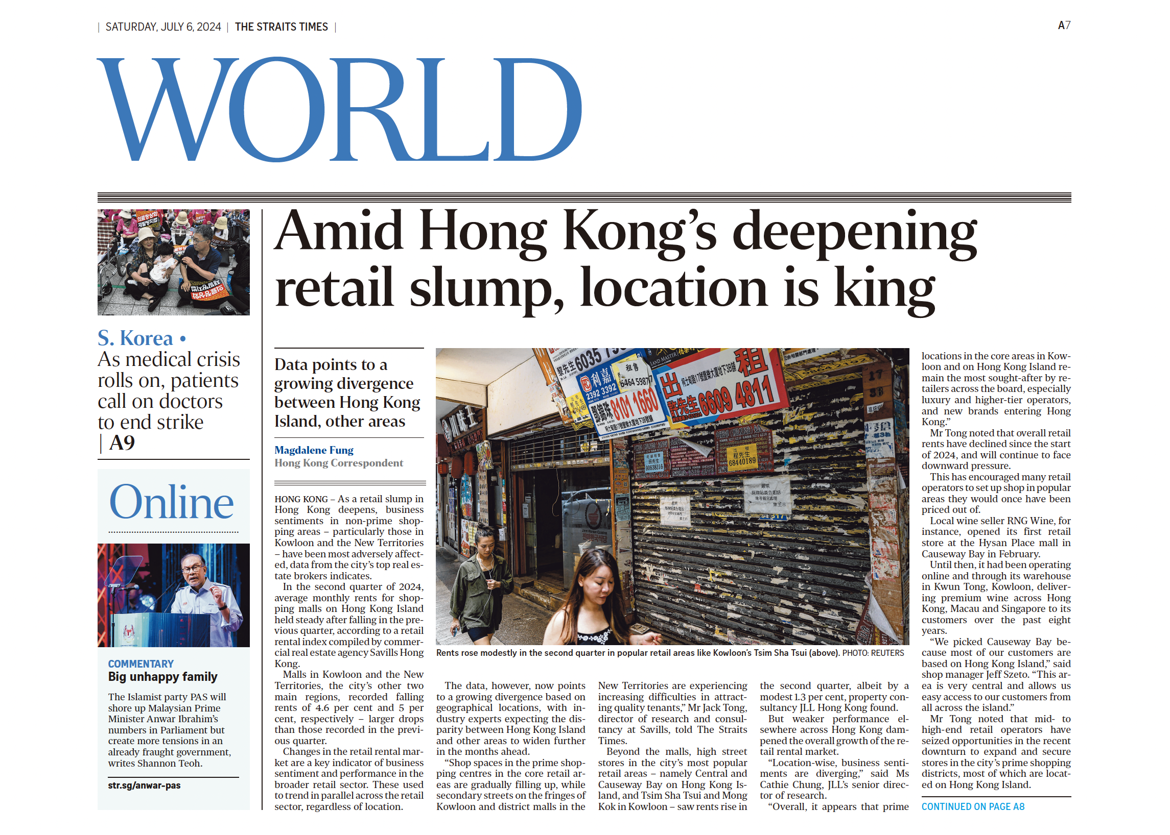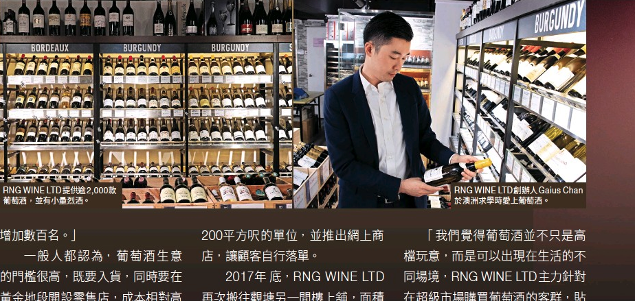 ....."Local wine seller RNG Wine, for instance, opened its first retail store at the Hysan Place mall in Causeway Bay in February. Until then, it had been operating online and through its warehouse in Kwun Tong, Kowloon, delivering premium wine across Hong Kong, Macau and Singapore to its customers over the past eight years. “We picked Causeway Bay because most of our customers are based on Hong Kong Island,” said shop manager Jeff Szeto. “This area is very central and allows us easy access to our customers from all across the island.”